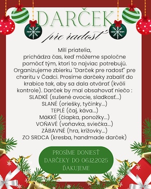 zapojte sa s nami do projektu "Darček pre radosť". Krabičky, ktoré od vás vyzbierame, budú venované Charite v Čadci, kde pomáhajú ľuďom a rodinám v núdzi. Krabičky prosíme priniesť najneskôr do 06.12.2025. Ďakujeme za spoluprácu.